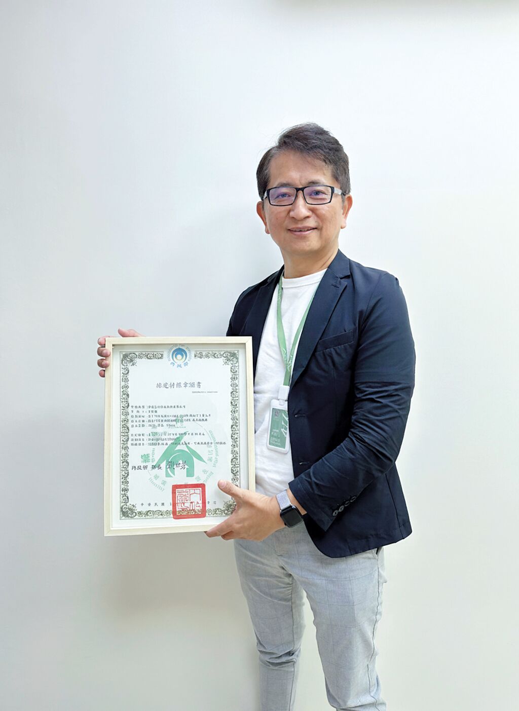 AIM風光隔熱膜獲得綠建材標章,是台灣第一家生產製造的本土品牌,律建生活科技總經理邱建宇與證書合影。圖/業者提供